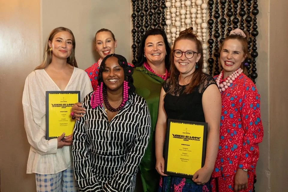 Kuvassa YFD x Aarikka -suunnittelukilpailun voittajan julkistus Meri Milashin festarietkoilla -24. Korukategorian voittaja Eveliina Saarentaus, AVA-korvakorut, Eeva Räsänen asustekategorian voittaja, POP-laukku. Tuotteet myynnissä nyt.